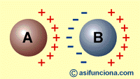 Observemos ahora las esferas de la siguiente ilustración: una A y otra B. Si frotamos la esfera A ésta se cargará electrostáticamente, con signo positivo (+), por haber quedado con exceso de protones al perder parte de sus electrones. Si seguidamente la acercamos a la esfera B (que al no haber sido frotada mantiene su equilibrio electrónico neutro intacto) los protones en exceso se agruparán en la zona periférica que queda enfrentada a B. Al mismo tiempo, parte de la carga negativa de los electrones contenidos en los átomos de esa otra esfera se agruparán frente a la periferia de A, mientras las cargas positivas se reparten en la zona opuesta de la propia esfera B.