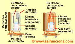 Este dispositivo se compone de una lámina bimetálica encerrada en una cápsula de cristal rellena de gas neón (Ne).