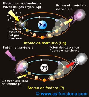 Al mismo tiempo, para que se pueda obtener luz visible, los fotones de luz ultravioleta liberados impactan sobre la capa fosforescente que recubre la pared interior del tubo de cristal de la lámpara, excitando los electrones de los átomos de fósforo (P)