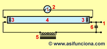energía se descarga dentro del tubo de la lámpara, en forma de arco