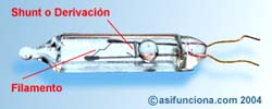 Cuando la corriente trata de atravesar la resistencia que ofrece el shunt, provoca que la capa de que recubre el alambre y que ha impedido hasta ese momento su paso se destruya, restableciéndose así la circulación de corriente la eléctrica a través del propio shunt. De esa forma, aunque interiormente la bombilla se encuentra apagada por carecer ya de filamento, este puente auxiliar que se crea permite que la corriente continúe llegando al resto de las bombillas, manteniéndolas encendidas.