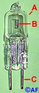 (B) el filamento de tungsteno, con su correspondiente soporte y (C) las conexiones exteriores.