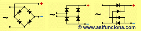 ilustran tres formas de esquematizar en un diagrama la conexión de esos cuatro diodos para obtener un rectificador de onda completa.