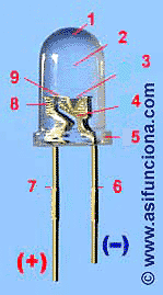 circuito eléctrico o electrónico externo. En un LED nuevo este terminal se identifica a simple vista, porque siempre es más corto que el terminal positivo. 7.- Alambre terminal positivo (+) correspondiente al ánodo del