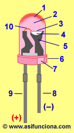 al. cátodo del chip. 8.- Terminal de conexión externa negativo (). correspondiente al cátodo (de tamaño más corto que el conectado al ánodo). 9.- Terminal