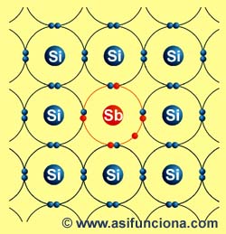 (Sb) (elemento perteneciente los elementos semiconductores del Grupo Va de la Tabla Periódica, con cinco electrones en su última órbita o banda de valencia), estos átomos se integrarán a la estructura del silicio y compartirán cuatro de sus cinco electrones con otros cuatro pertenecientes a los átomos de silicio o de