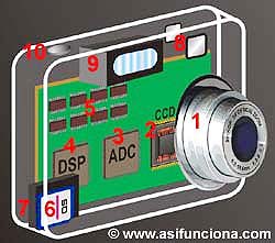En la ilustración más arriba se pueden observar, de forma simplificada, las partes que integran una cámara digital compacta, tal como se explican a continuación: