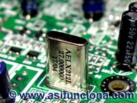 En esta foto la flecha señala un oscilador de cuarzo instalado en la placa base de un ordenador. Su función es proporcionar al microprocesador o CPU, a los buses y al. reloj del sistema los pulsos de alta frecuencia necesarios para su funcionamiento.