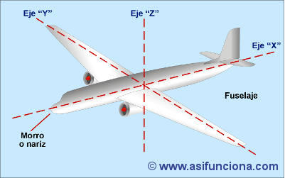 EJES SOBRE LOS QUE SE MUEVE EL AVIÓNUn avión es en sí un cuerpo tridimensional, por lo que para moverse en el aire se vale de tres ejes o líneas imaginarias.Eje “X” o longitudinal.Comienza en el morro o nariz del avión y se extiende a través de todo el fuselaje hasta llegar a la cola. El movimiento del avión sobre el eje “X” se denomina “alabeo o balanceo” y se controla por medio de los alerones.Eje “Y” o lateral.Se extiende a todo lo largo de la envergadura de las alas, es decir, de una punta a la otra. El movimiento sobre el eje “Y” se denomina “cabeceo” y para controlarlo se utiliza el timón de profundidad o elevadores, situados en la cola del avión.Eje “Z” o vertical.Atraviesa la mitad del fuselaje. El movimiento sobre el eje vertical se denomina “guiñada” y se controla por medio del timón de cola o dirección, situado también en la cola del avión.