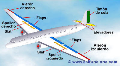 SUPERFICIES FLEXIBLES DE CONTROLLos aviones poseen, como mínimo, cuatro superficies flexibles o movibles exteriores que le permiten despegar y aterrizar, mantenerse en el aire y cambiar el rumbo.Dos de esas superficies son los alerones y los flaps, situados en las alas; las otras dos son, el timón de dirección (o timón de cola) y el timón de profundidad (o elevadores), ambas situadas en la cola.El movimiento o control de las superficies flexibles lo realiza el piloto desde la cabina empleando dos dispositivos:•Timón, (sustituido en algunos aviones por una palanca o bastón)•Pedales de freno