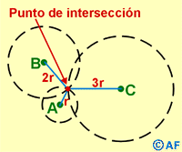 Si trazamos sobre un mapa de la zona tres circunferencias, tomando como centro los puntos A, B y C y como valor