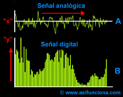 En la ilustración superior, las magnitudes variables de la señal “analógica”