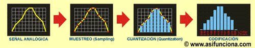 de un sensor fotográfico o de video. Esos dispositivos serán los encargados de convertir los sonidos y las imágenes que captan en señales eléctricas analógicas en forma de ondas sinusoidales. Seguidamente las señales analógicas así obtenidas se someten al proceso de digitalización comenzando con la toma de muestras de las señales analógicas, para continuar cuantificándolas y, por último, codificándolas en formato digital. |
