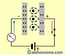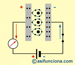 Los electrones que ha cedido la placa izquierda, ahora positiva (+), pasan a la placa derecha que se convierte, a su vez, en negativa () por tener ahora electrones en exceso con ese signo, desde el mismo momento que la corriente ha comenzado a circular por el circuito externo. En resumen, al finalizar el proceso de carga