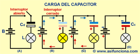 Cd, un interruptor abierto y una lámpara apagada,. En (B) el interruptor está cerrado, por lo que la corriente (representada por las flechas) puede circular por el circuito, el capacitor comienza a cargarse y la lámpara se enciende completamente. En (C) continúa la carga del