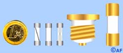 izquierda a derecha, fusible de cristal con un fino alambre en su interior que