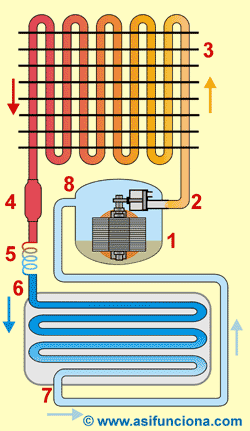 7.- Salida del gas después de absorber calor del frigorífico.