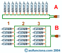 A.- Guirnalda con microbombillas conectadas en serie. B.-