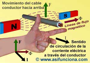 del campo magnético de un imán permanente (partiendo siempre del polo norte N en dirección al polo sur S), el dedo medio se coloca formando un ángulo de 90º con el índice para apuntar en el mismo sentido que fluye la corriente eléctrica I a través del cable conductor en el que se crea un campo electromagnético a su alrededor. Bajo esas condiciones, el dedo pulgar, que se ha colocado formando una L en relación con el dedo índice, señalará en la dirección F hacia donde se moverá el cable cuando su campo electromagnético interactúe con el campo magnético del imán permanente.