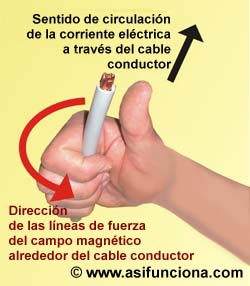 (F.E.M.) que tenga conectada suministrándole la corriente eléctrica. Para determinar en cada caso en que sentido se crean esas líneas de fuerza se emplea la Regla de la mano derecha. Como se puede observar en la ilustración, mientras esa mano agarra el cable conductor y el dedo índice apunta en el mismo sentido que circula la corriente, la posición de los cuatro dedos
