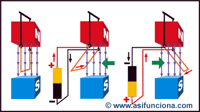 conecta en su parte posterior, y fluye en dirección al polo negativo () de la propia fuente,