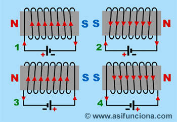 Por tanto, en este ejemplo el polo norte N se formará en ese extremo izquierdo, mientras que en el derecho se formará el polo sur S. En (2) la batería se encuentra conectada a la fuente de suministro eléctrico de la misma forma que en (1), pero las vueltas del alambre de la bobina se han enrollado también desde la izquierda, pero comenzando a envolver el núcleo a partir de la parte trasera. Como se puede observar, los polos magnéticos en esta ocasión aparecen invertidos con relación a (1). Contrariamente en (3) y (4) es la conexión de la batería la que se ha invertido con relación a (1) y (2) y, como se puede observar, los polos magnéticos del núcleo del electroimán varían también según la forma en que se encuentran enrolladas en cada caso las vueltas de la bobina. La polaridad que adquiere un electroimán es importante porque, aplicada al motor de