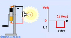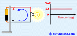 En este caso si hacemos una representación gráfica utilizando un eje de coordenadas para la tensión o voltaje y otro eje para el tiempo en segundos, se obtendrá una corriente alterna de forma rectangular o pulsante, que parte primero de cero volt, se eleva a 1,5 volt, pasa por 0 volt, desciende para volver a 1,5 volt y comienza a subir de nuevo para completar un ciclo al pasar otra vez por cero volt.