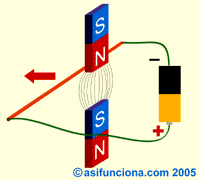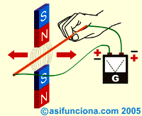 Ahora bien, si en vez de moverlo colocáramos el mismo conductor de cobre dentro del campo magnético de los dos imanes y aplicamos una diferencia de potencial, tensión o voltaje en sus extremos,