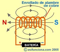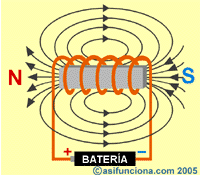 Después, si a esa misma bobina con núcleo de aire le introducimos un trozo de metal como el hierro, ese núcleo, ahora metálico, provocará que se intensifique el campo magnético y actuará como un imán eléctrico (o electroimán), con el que se podrán atraer diferentes objetos metálicos durante todo el tiempo que la corriente eléctrica se mantenga circulando por las espiras del enrollado de alambre de cobre.