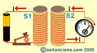 También, si en lugar de mover la bobina S1 abrimos y cerramos ininterrumpidamente el interruptor del circuito de la pila, la fuerza contraelectromotriz que se crea cada vez que se abre el circuito interrumpiendo la formación del campo electromagnético, inducirá también una corriente eléctrica en la bobina S2, que registrará el movimiento de la aguja del galvanómetro.