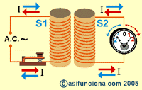 La corriente eléctrica alterna circulando por una bobina (S1) crea a su alrededor un campo. electromagnético variable, capaz de inducir por sí mismo corriente alterna en otra bobina (S2) colocada a. su lado.