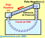 cationes), con defecto de electrones< en el polo positivo (+) de la propia fuente de FEM.