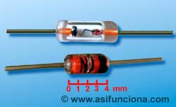 Diodos de de señal para alta frecuencia. Arriba.- De. germanio (Ge) de punta de contacto. Abajo.- De silicio (Si).