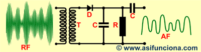 se compone, además, de dos capacitores C y una resistencia R. Una vez que la onda de. radiofrecuencia ha sido detectada y demodulada por el diodo,
