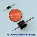 A ese diodo le corresponde un encapsulado DO-41. El diodo de abajo, de mayor tamaño, puede soportar una corriente de 10 ampere y trabajar, igualmente, con un voltaje de 1000 volt,