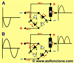 Un puente rectificador de cuatro diodos funciona de la siguiente forma: como se puede observar en la parte (A) de la ilustración, durante el primer medio ciclo negativo () de la corriente que proporciona la fuente de suministro alterna (C.A.) conectada al puente rectificador, los electrones atraviesan primero el diodo (1), seguidamente el consumidor (R) y después el diodo (2) para completar así la circulación de la corriente de electrones por una mitad del circuito correspondiente al puente rectificador.