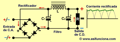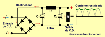 capacitores. La función del filtro consiste en compensar las variaciones o deformaciones residuales que puedan haber quedado remanentes en la corriente rectificada. Para ello durante el medio ciclo negativo los capacitores se cargan y durante el siguiente medio ciclo positivo se descargan para rellenar los espacios sin carga que se crean entre una cresta y la