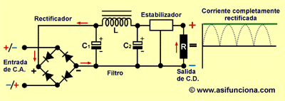 digitales, reproductores mp3, ordenadores portátiles y muchos otros equipos electrodomésticos y electrónicos más, que funcionan con corriente directa. De esa forma un puente rectificador permite que cualquier dispositivo o equipo de corriente directa (C.D.) se pueda conectar a la red de corriente alterna (C.A.) doméstica para poderlo utilizarlo de esa forma o, de lo contrario, cargar sus baterías.