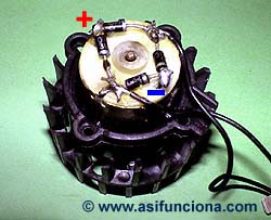 eléctrico acoplado al ventilador de un secador de pelo. Los cables de color negro corresponden a la entrada de la corriente alterna (C.A.) que alimenta al puente rectificador. El polo positivo [con el signo (+) en color rojo] y el negativo [con el signo () en color azul] indican la polaridad de salida de la corriente directa ya rectificada por el puente. En este caso los polos positivo y negativo se encuentran conectados directamente en los bornes de entrada de la