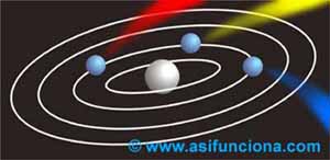 átomo. Cuando por cualquier circunstancia un electrón libre poseedor de exceso de energía pasa a ocupar el lugar que ha dejado otro electrón en una órbita en la que ha quedado un hueco, dicha energía la libera en forma de fotón de luz. El color de la luz del fotón emitido dependerá en cada caso del material o elemento químico al que pertenece el átomo. En esta ilustración simulada se muestran tres electrones emitiendo fotones de luz de diferentes colores cuando ingresan al interior de una órbita donde existen huecos que han dejado libres otros electrones. Es necesario aclarar que en el caso del