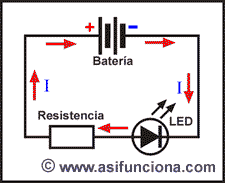 Cuando a un diodo LED le aplicamos corriente eléctrica procedente de una batería o de cualquier otra fuente de corriente directa
