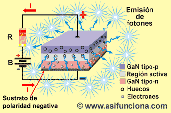 (GaN) como elemento semiconductor. Aquí la corriente de electrones I que parte del polo negativo () de la batería B, penetra en el diodo LED por el cátodo (negativo), correspondiente a la región N. Cuando a este chip se le aplica un voltaje adecuado que lo polarice de forma directa, los electrones adquieren la energía extra necesaria que les permite circular y atravesar las dos regiones que lo componen. Desde el mismo momento que la