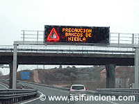 Panel informativo compuesto por diodos LEDs, situado en una carretera para avisar en esta ocasión a los conductores la existencia de bancos de niebla.