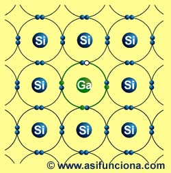(Ga) (elemento perteneciente al Grupo IIIa de la Tabla Periódica con tres electrones en su última órbita o banda de valencia), al unirse esa impureza en enlace covalente con los átomos de silicio quedará un hueco o agujero, debido a que faltará un electrón en cada uno de sus átomos para completar los ocho en su última órbita. En este caso, el átomo de galio tendrá que captar los electrones faltantes, que normalmente los aportarán los átomos de silicio, como una forma de compensar las cargas eléctricas. De esa forma el material adquiere propiedades conductoras y se convierte en un semiconductor extrínseco dopado tipo-P (positivo), o aceptante, debido al exceso de cargas positivas que provoca la falta de electrones en los huecos o agujeros que quedan en su estructura cristalina.