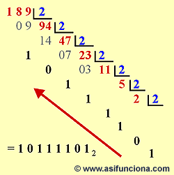 Seguidamente realizaremos la operación inversa, es decir, convertir un número perteneciente al sistema numérico decimal (base 10) a un número binario (base 2). Utilizamos primero el mismo número 189 como dividendo y el 2, correspondiente a la base numérica binaria del número que queremos hallar, como divisor. A continuación el resultado o cociente obtenido de esa división (94 en este caso), lo dividimos de nuevo por 2 y así, continuaremos haciendo sucesivamente con cada cociente que obtengamos, hasta que ya sea imposible continuar dividiendo. Veamos el ejemplo: |