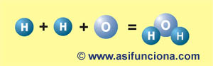 Unión de dos átomo o moléculas simples de hidrógeno (2H), más una de oxígeno (O),