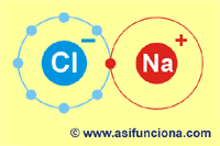 o anión y la de un ión sodio positivo (Na+) o catión, se atraen mutuamente para dar lugar a la formación de una molécula de cloruro de sodio,