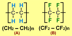 constituye un material plástico similar al polietileno, pero con una estructura atómica diferente, pues en lugar de combinar átomos de carbono (C) y de hidrógeno (H), estos últimos se sustituyen por átomos de flúor (F).